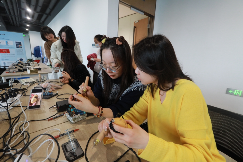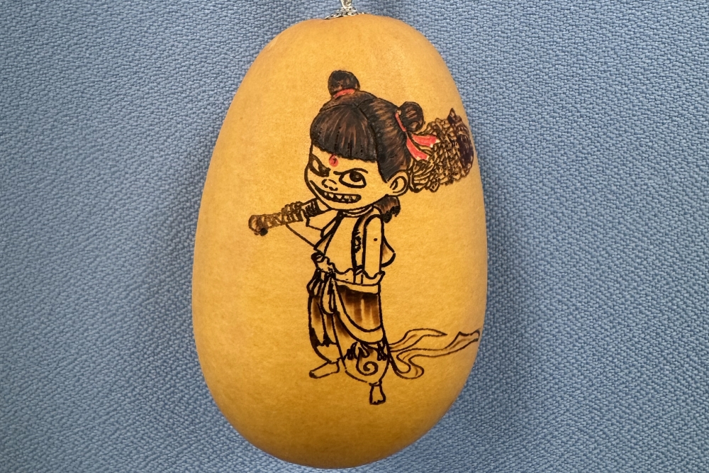 活動現場,非遺傳承人為大家講述了浸烙葫蘆和螺鈿技藝的制作工藝、歷史背景和文化內涵。在老師的指導下,大家進行葫蘆烙畫和螺鈿創作,將傳統技藝和神話傳說相結合,在葫蘆上生動呈現國民IP“哪吒”形象,運用現代審美,制作出精美的螺鈿胸針和手鏈。